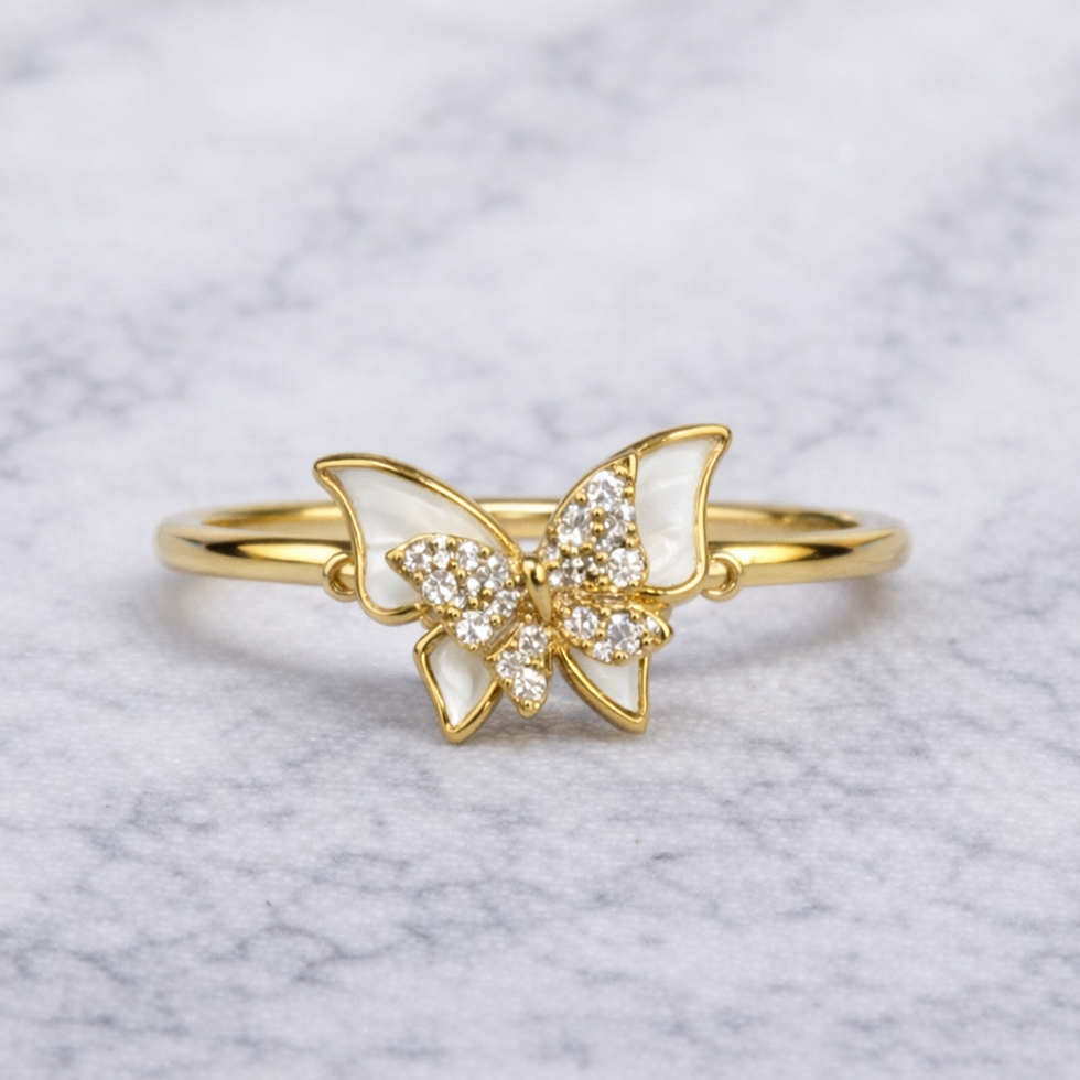 The Gold 3D Butterfly Ring is designed to add a delicate statement to your look. Featuring a dimensional butterfly design on a sleek silver band this piece blends elegance with a soft feminine feel. Perfect for everyday wear and special occasions it elevates your outfit with a subtle graceful touch.