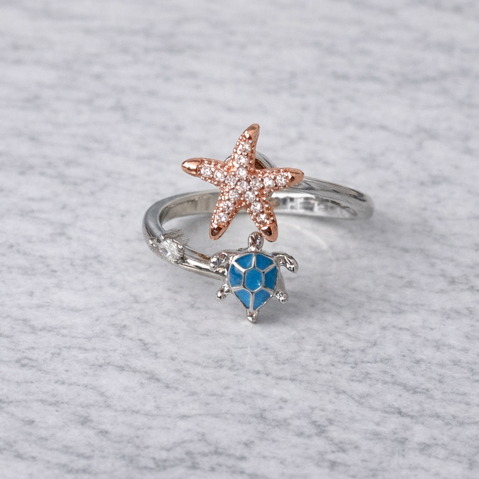 Silver Spinning Turtle and Starfish Adjustable Ring
